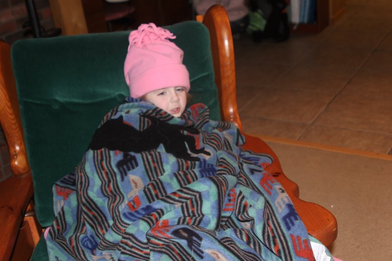 Mira has decided that she wants to be sick lately and has thrown up the last two nights all over. The weird thing is that it is only once and then she feels fine. Last night Erika gave me permission to hang out after work and have a beer at the bar. I had been there 15 minutes and just gotten my first beer and 4 yummy tacos when the phone rang. “Get home now, there’s puke everywhere.” While I did rush home, I could not help but finish my tacos and beer. They were so good! This morning, Mira got up and decided that she was freezing and would need a lot of stuff to keep her warm, here’s our arctic explorer: