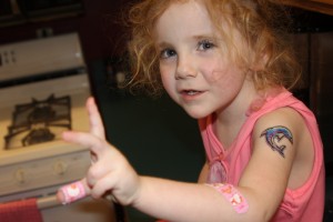 Once we got home, we found some old tattoos and marked her up. She’s still wearing this dolphin more than a week later. And no, she doesn’t have any need for those bandages. When your sick 4 year old asks for a band aid, you just give it to her.