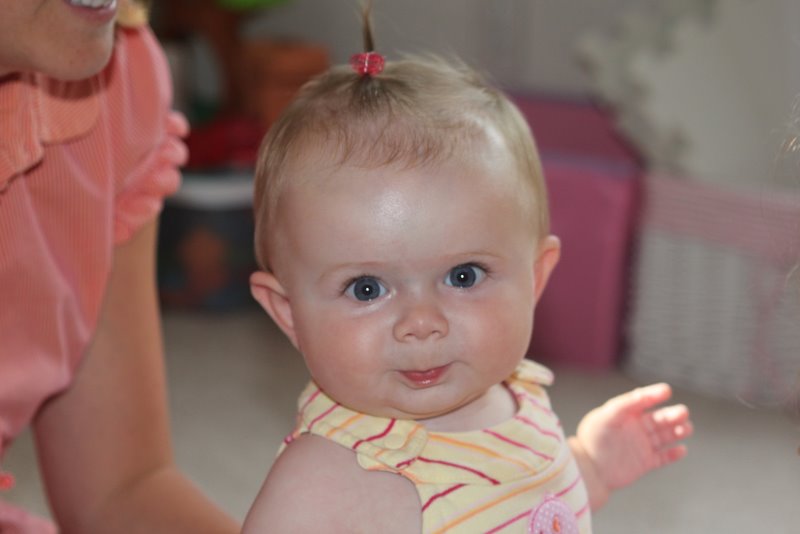 The cool thing about this day was the little pony Luna’s daycare was able to put in her hair. Yes, Lindsay Kitko found enough of Luna’s hair to get this neat little pony in. Snif, our little baby is growing up. She’s eating baby food and soon she’ll be crawling! Here’s our perfect little baby!