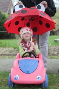 It was wet and a bit drizzly. We convinced Mira that she wanted to go by riding in the pink car and using the Ladybug umbrella. Gotta love novelty items!