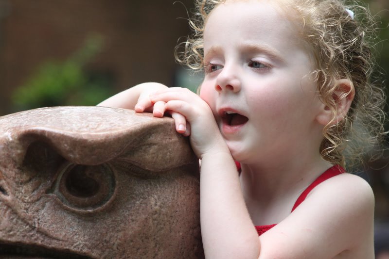 We spent some time looking at animals, but quite frankly Mira was not terribly interested in animals that should couldn’t touch or ride. And of course, we all know that a giant panda would sooner maul her than actually take Mira for a ride. Mira did find a giant statute of a griffin that she was able to sit on and pose for a bit. You can see how hot and humid it was. Take a look at those crazy curls!