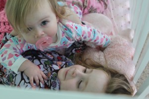 Here’s a picture of Luna’s sister. She was laying in Luna’s crib one day playing with her. At this point she just laid back and looked at her sister. We always ask her, “What’s your one job?” Her answer, “Protect my sister.” She just adores Luna.