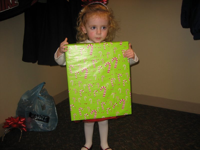 Which means that she sat with us for about 5 seconds, got bored, and made me go out in the hall with her. But I was smart and stuck one of those present costumes back on her and snapped this beauty: