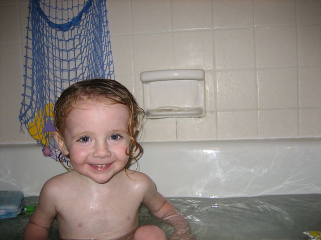 Here is a picture of Mira taking a bath this evening after a massive blowout she had in the living room. We don’t even bother with wipes that much anymore, we just run her to the bath tub. So, she was just sitting and playing in the tub for quite a while tonight. She was really having a fun time:
